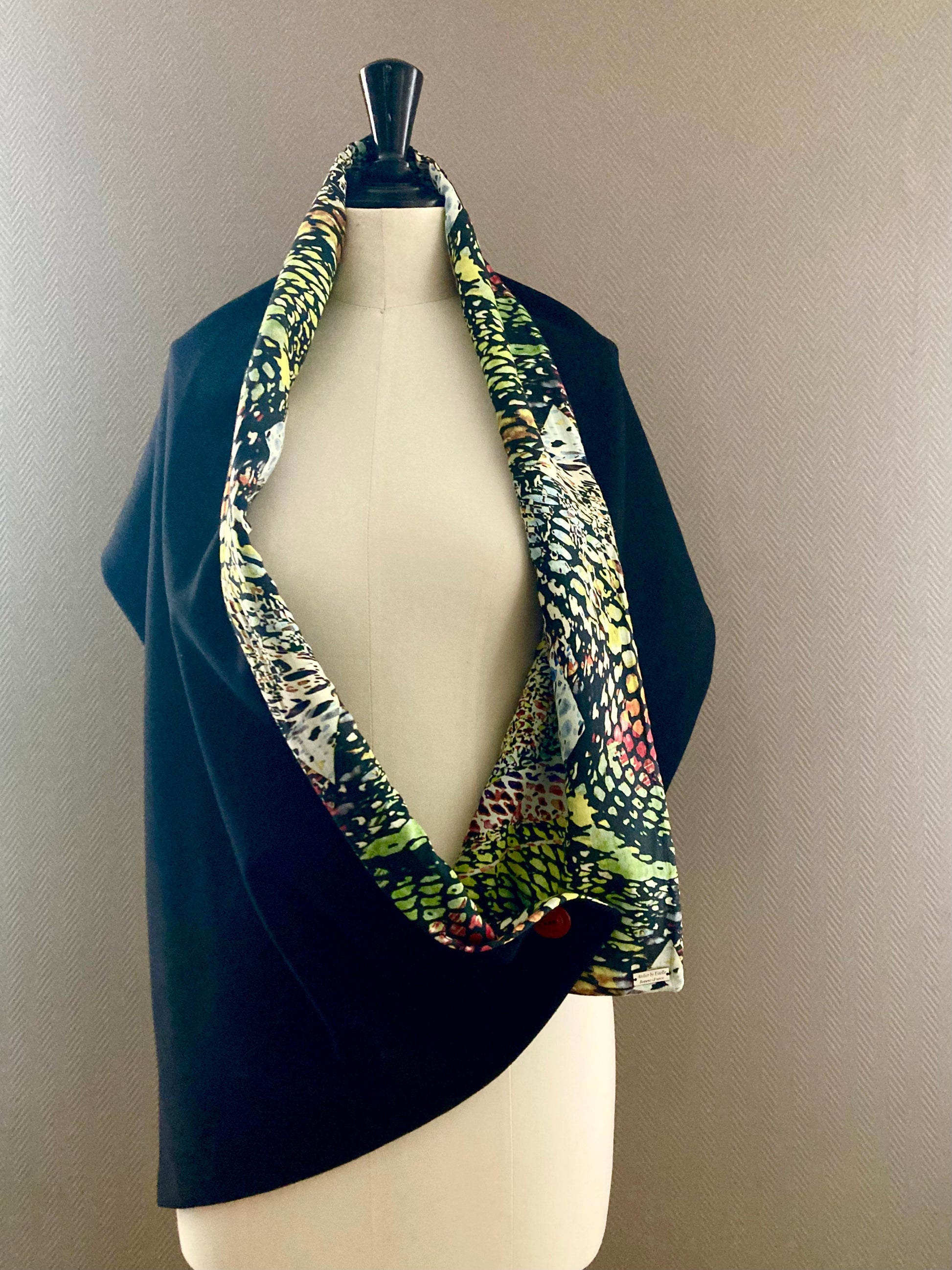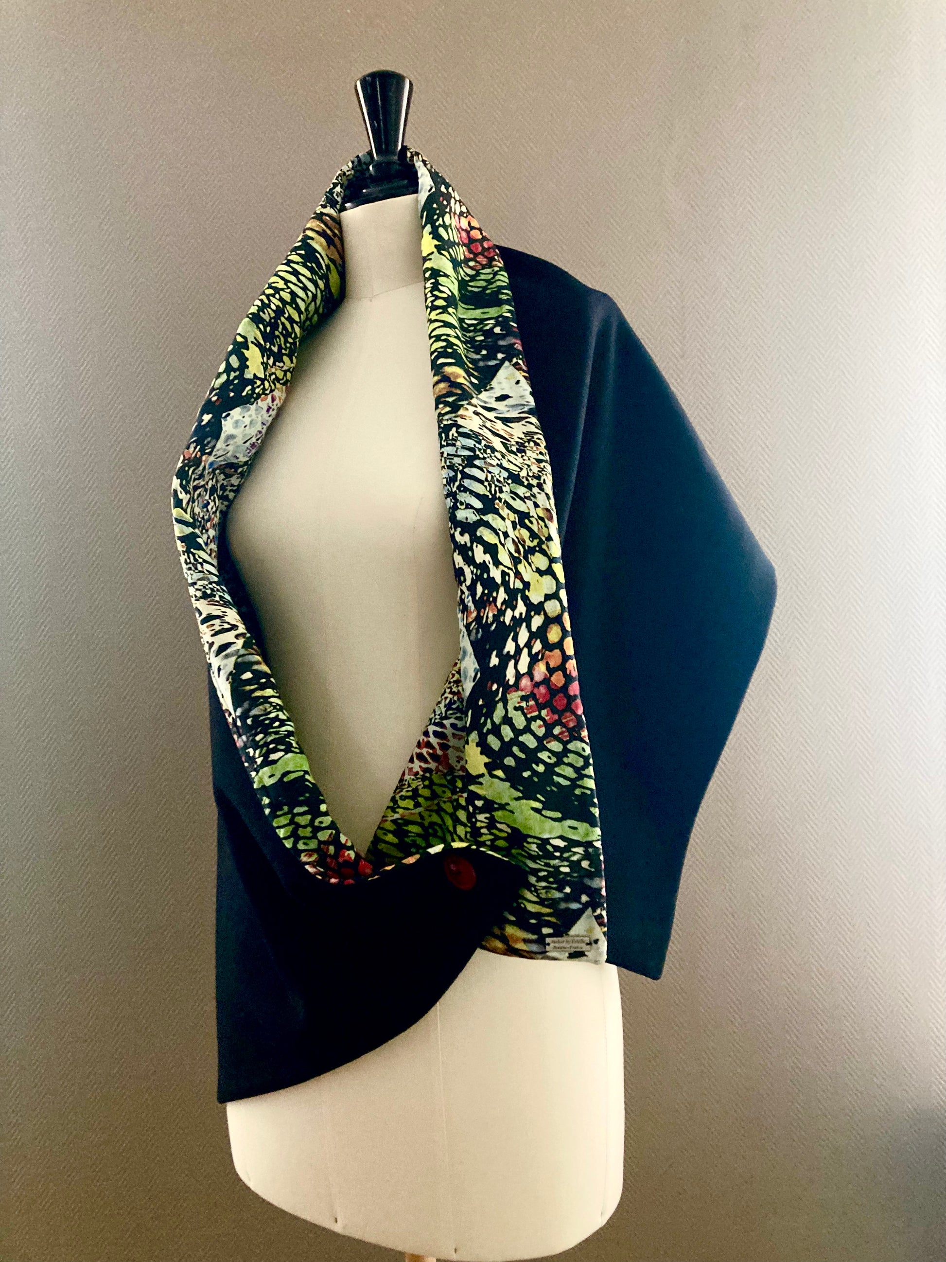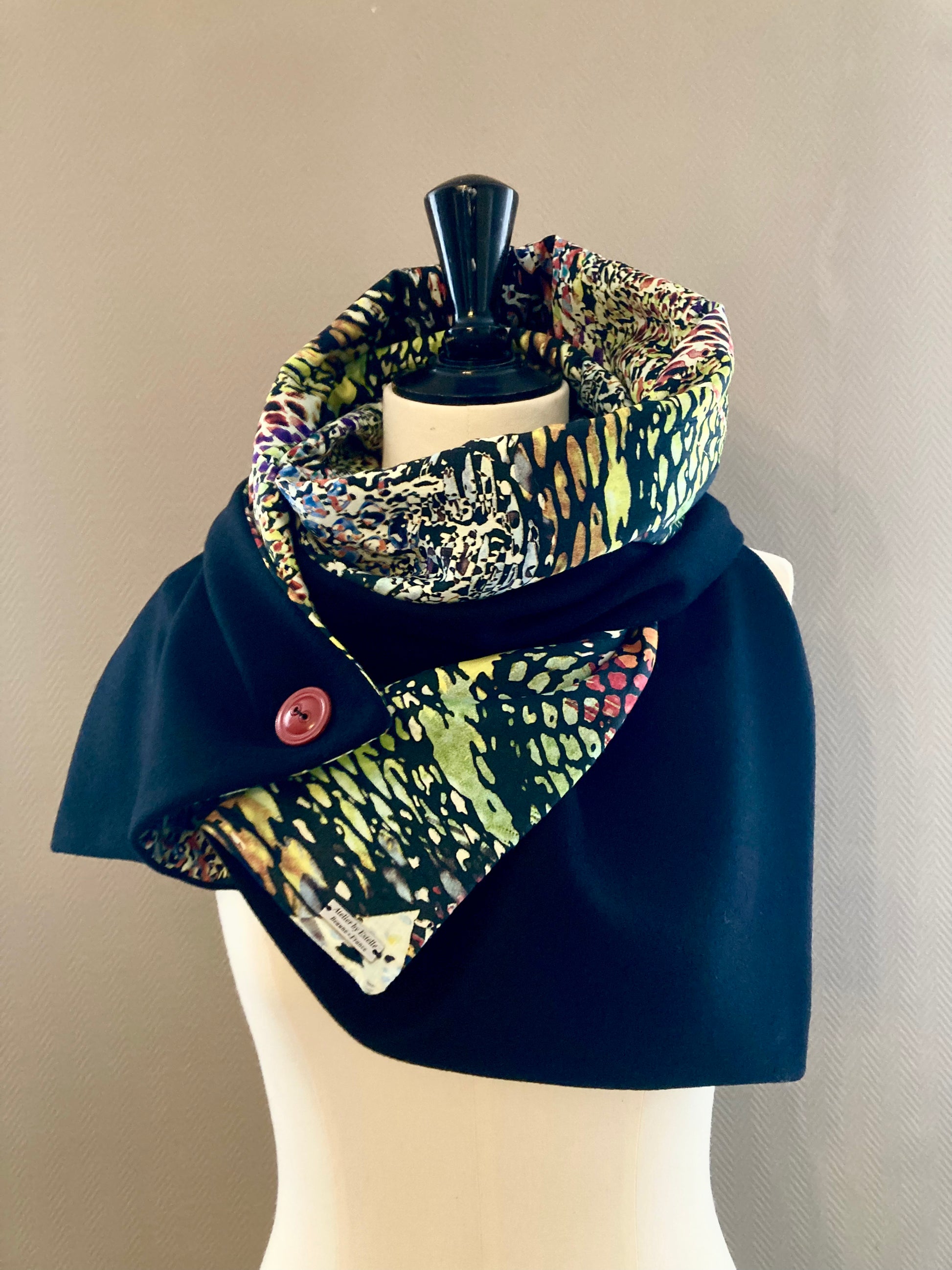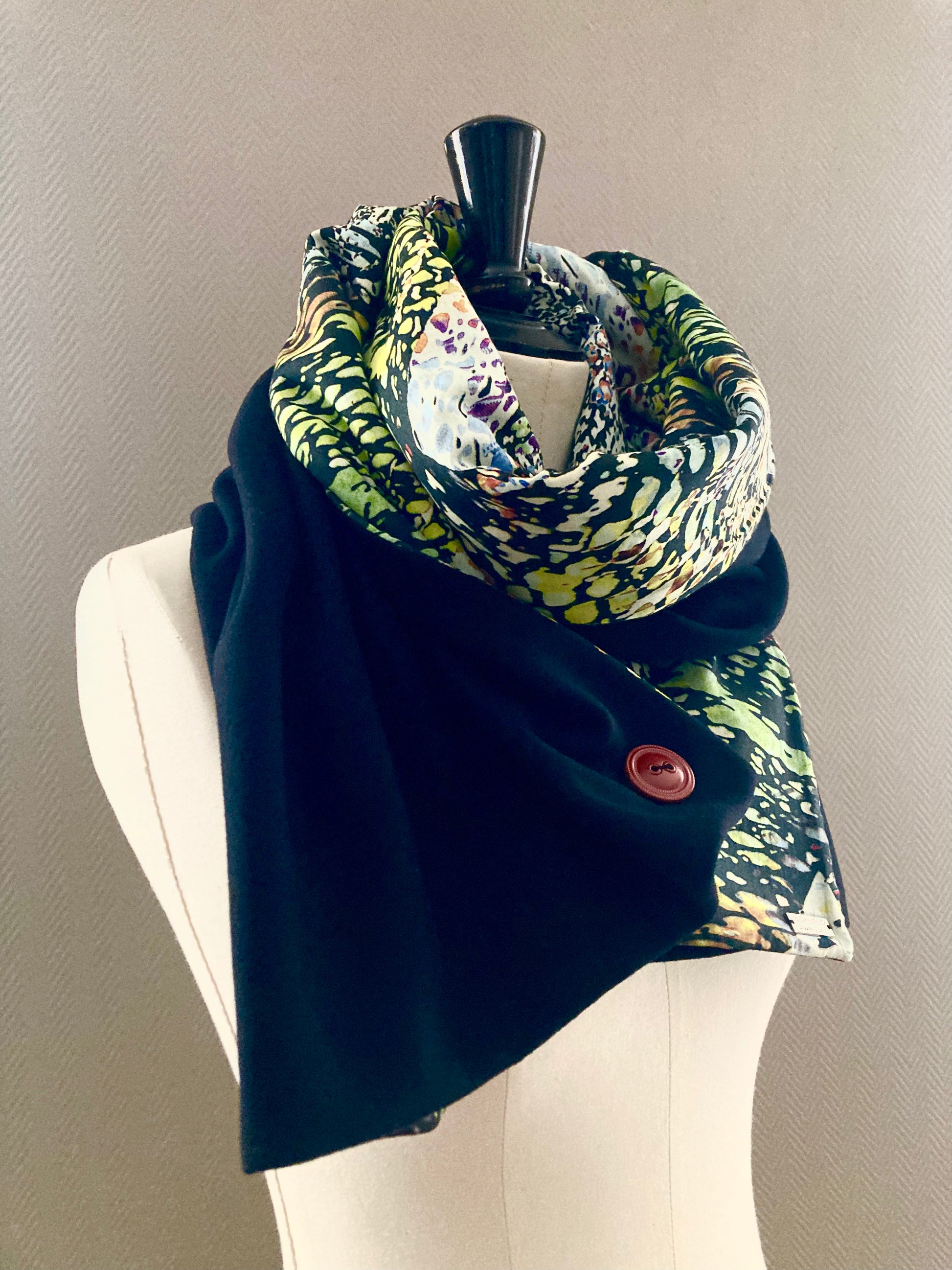Munie d’un bouton sir chaque face de l’écharpe, elle se porte aussi bien enroulée autour du cou, qu’en cache épaules, châle…à vous d’être créative !! 😍
